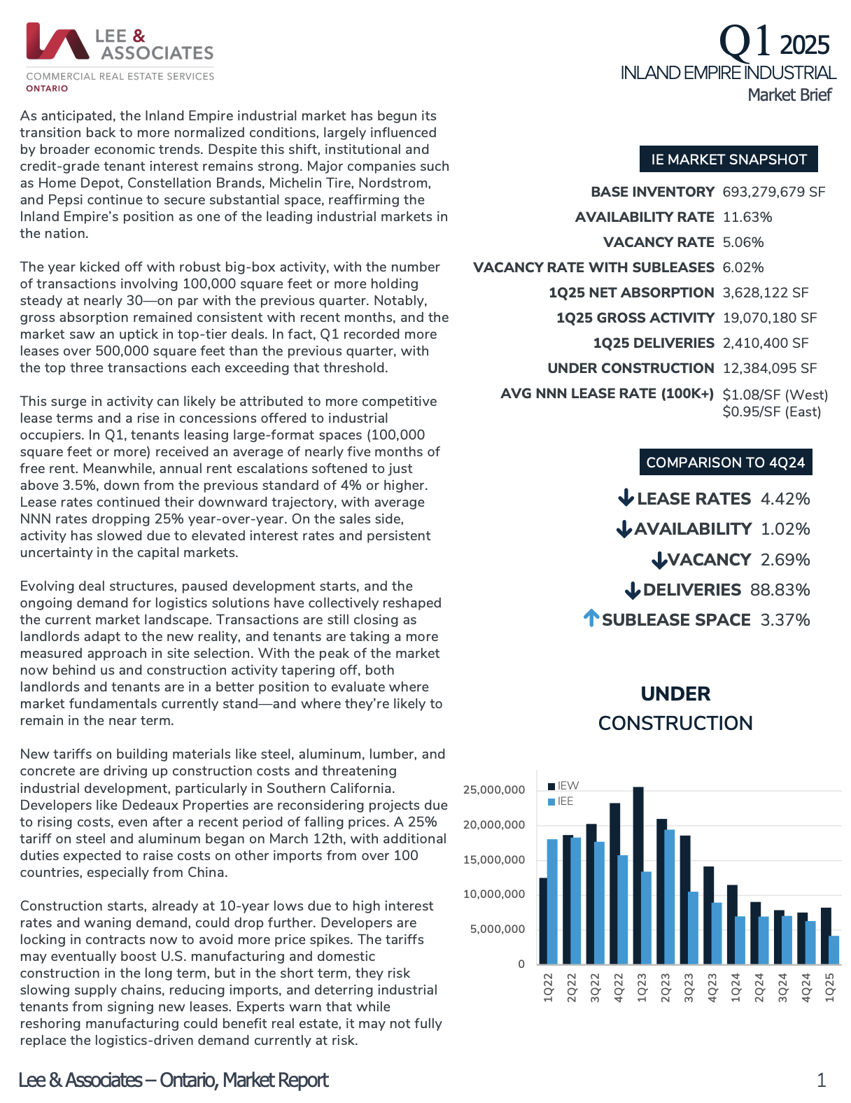Download Quarterly Report Q1 2025Established in 1987, Lee & Associates – Ontario has been the highest producing and grossing Lee & Associates office in the country for the last 10 years consecutively, as well as one of the highest grossing commercial real estate firms in the country annually. Since its inception, the Jones Industrial Team has consistently ranked among the top producing teams, contributing to the overall success and reputation of the firm.