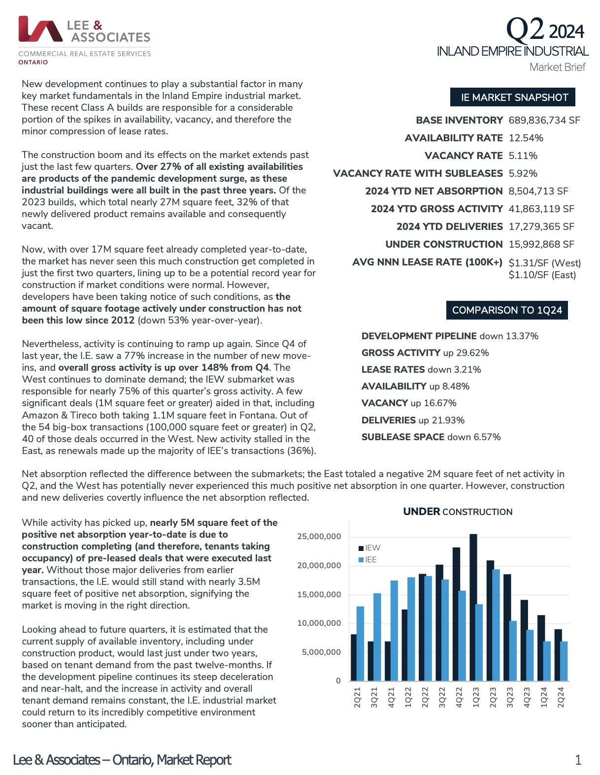 Download Quarterly Report Q2 2024Established in 1987, Lee & Associates – Ontario has been the highest producing and grossing Lee & Associates office in the country for the last 10 years consecutively, as well as one of the highest grossing commercial real estate firms in the country annually. Since its inception, the Jones Industrial Team has consistently ranked among the top producing teams, contributing to the overall success and reputation of the firm.